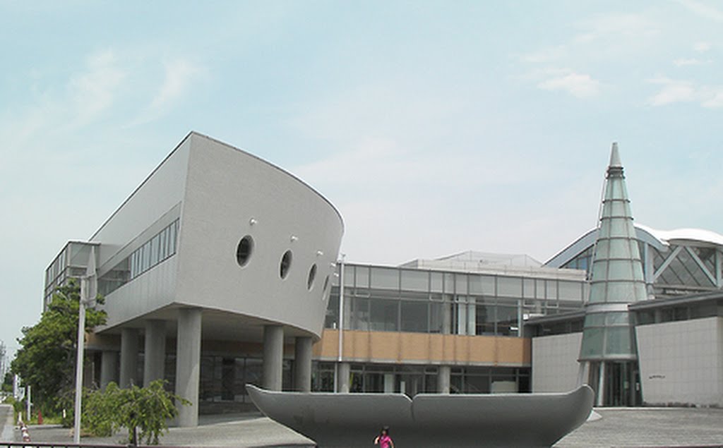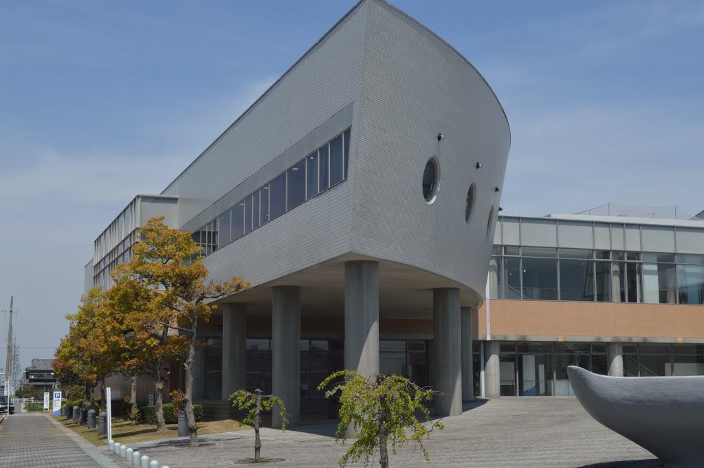 一言コメント:写真左の上部分が図書館。右奥は室内プール。手前の庭には大きなクジラの胴体と尻尾という変ったデザインの建物。カードは地元のみ(7月より海部地区まで拡充)。駐車スペース大。