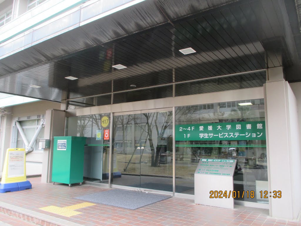 一言コメント:愛媛大学図書館。城北キャンパス正門入ってすぐ右側の建物の2階から4階にあります。