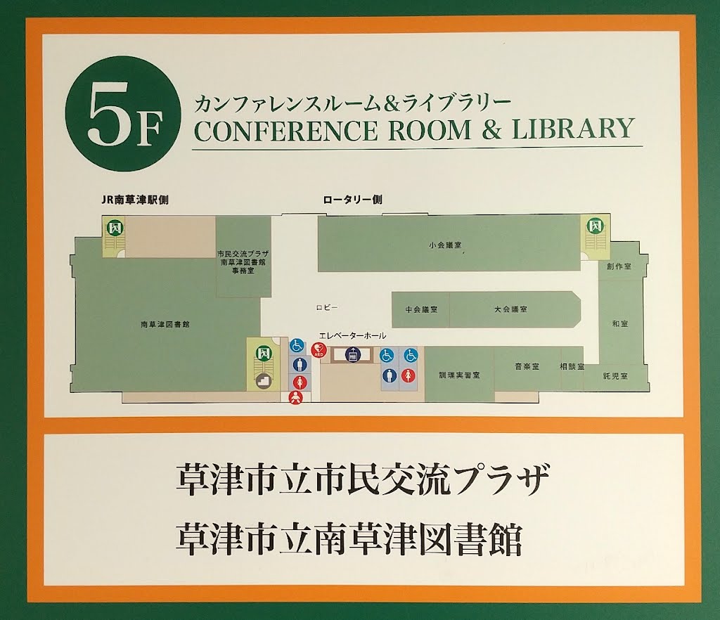 人気の南草津駅からデッキでつながっているビルの5階にある図書館。夜8時まで開いていてうらやましい。