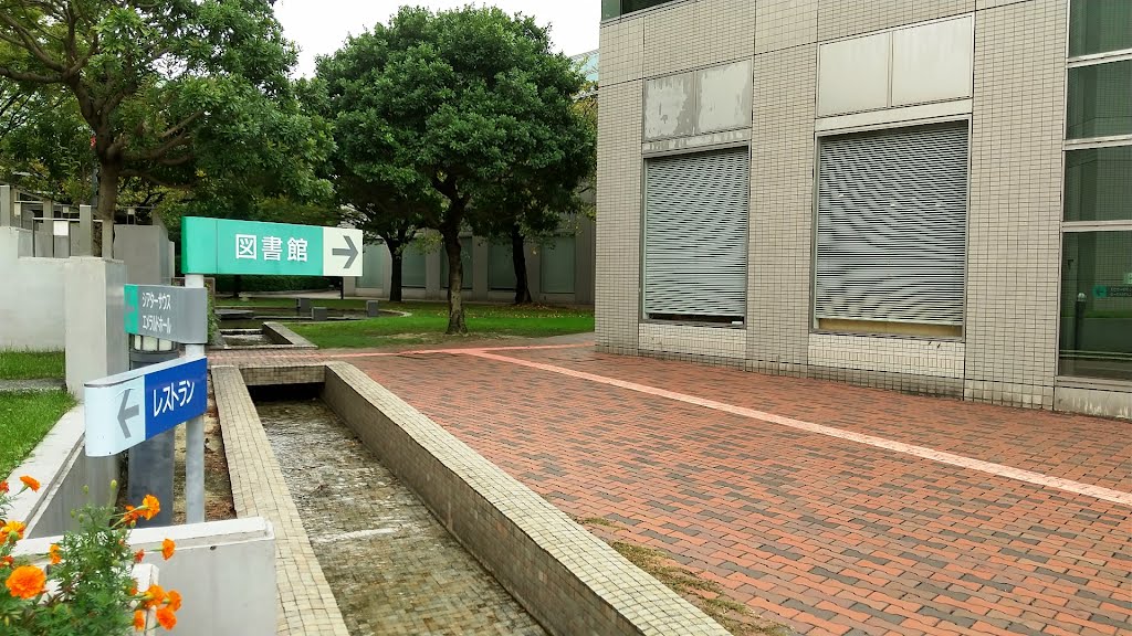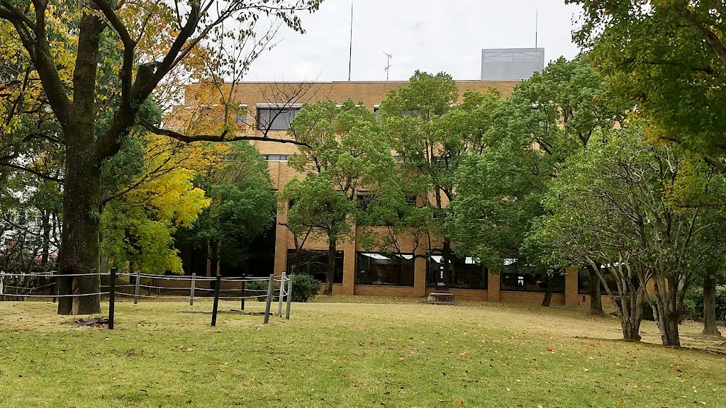 岡山駅からそう遠くない、街中心部にある図書館。2階の窓から公園で遊ぶ子どもらが望めます。